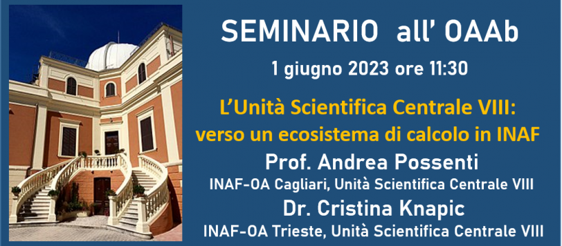 Giovedì 1 giugno alle ore 11:30, il Prof. Andrea Possenti dell’INAF-Osservatorio Astronomico di Cagliari e dell’Unità Scientifica Centrale VIII e la Dr Cristina Knapic dell’INAF-Osservatorio Astronomico di Trieste e dell’Unità Scientifica Centrale VIII, terranno il seminario dal titolo “L’Unità Scientifica Centrale VIII: verso un ecosistema di calcolo in INAF“.